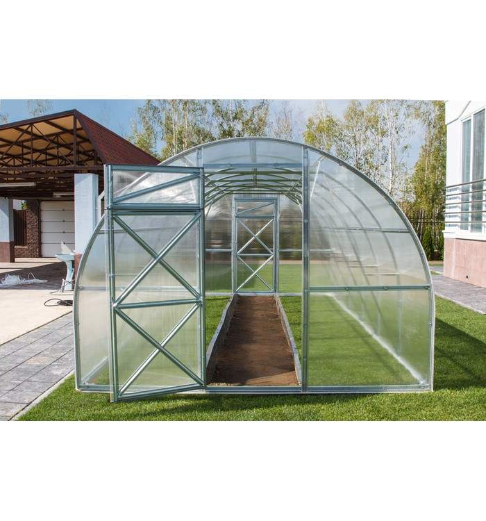 Kasvuhoone laius on optimaalne kolme peenra jaoks. Kasvuhoone ülesehitus võimaldab paigaldada sinna erinevat lisavarustust.