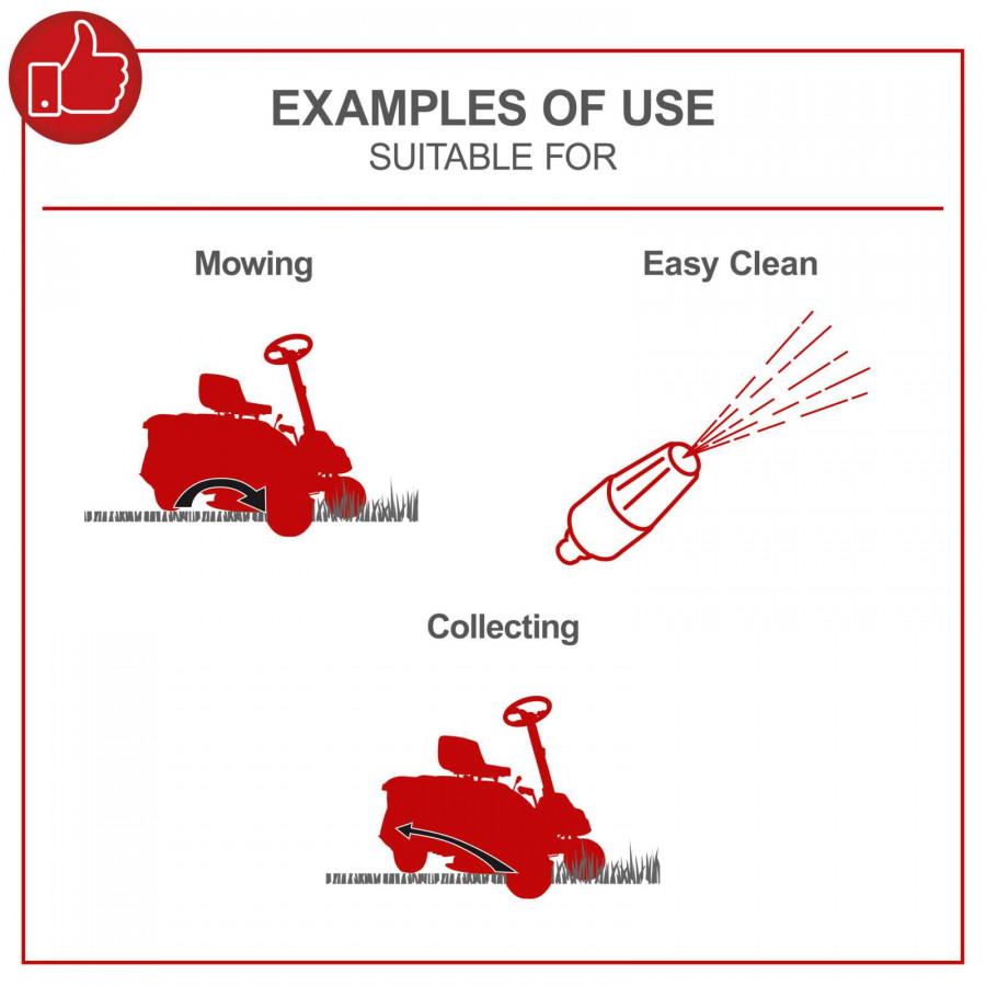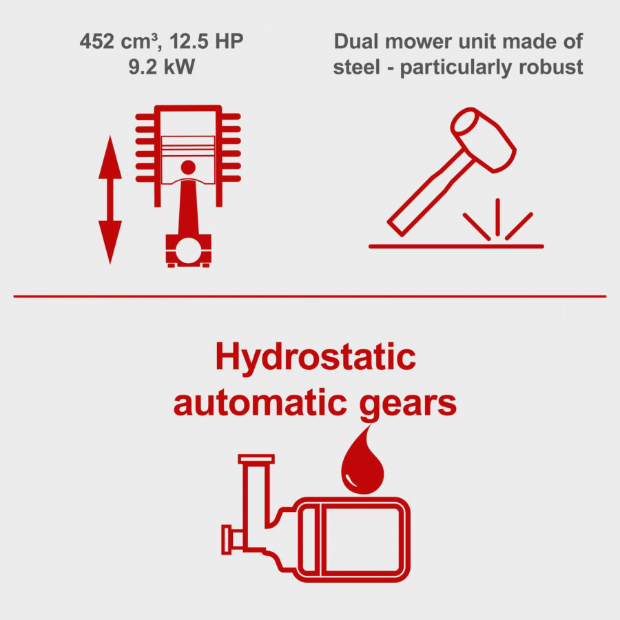 Mugavusvarustus: liikumissuuna pedaalist valik, terade nupust käivitamine, seadistatav juhiiste, topsihoidik, niiduseadme pesunippel, eesmine põrkeraud, juhikohalt tühjendatav koguja.