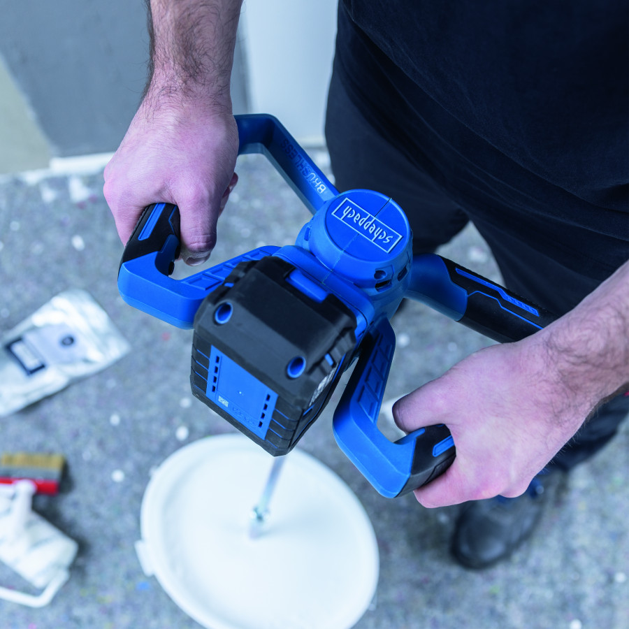 • Juhtmeta töö Scheppach IXES 20 V seeriaga – kõiki sellesse süsteemiseeriasse kuuluvaid akusid ja laadijaid saab kombineerida selle värvi- ja mördisegajaga