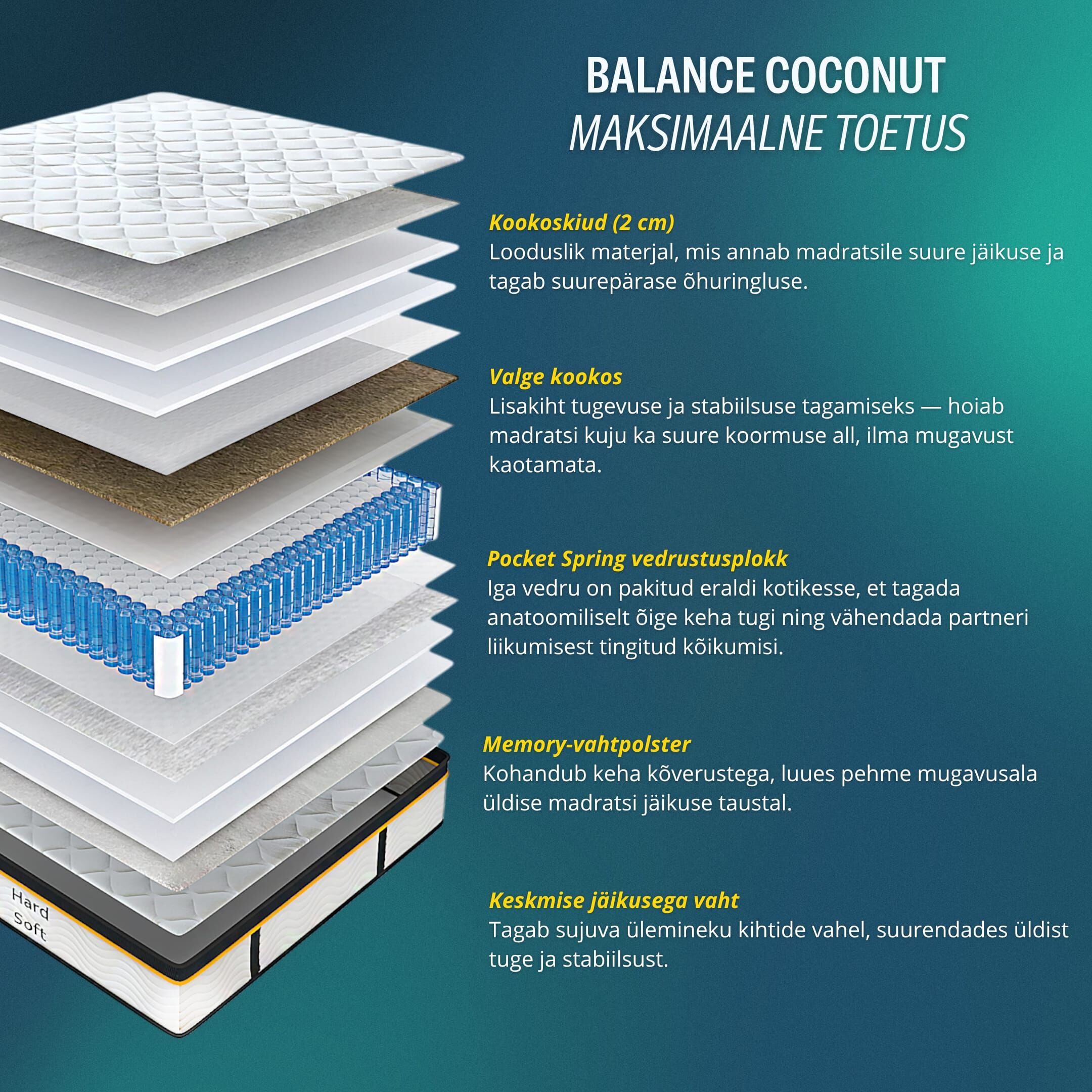 - Koostis: 14 kihti, sh kookoskiud, taskuvedru, vilt